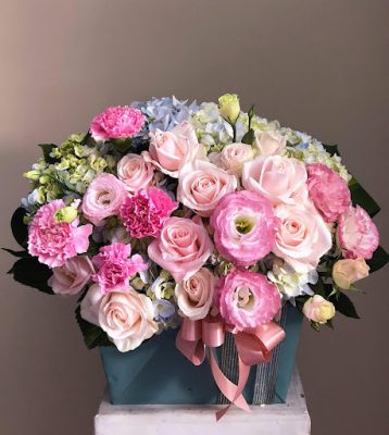 -Hộp hoa với hoa cẩm tú cầu, cát tường, hoa hồng phấn và các hoa lá phụ khác, với màu sắc nhẹ nhàng. sang trọng.